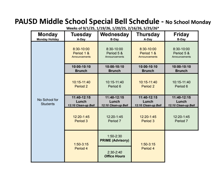 PAUSD Middle School Minimum Day Special Schedule